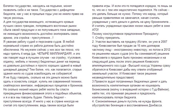 В Киеве на Печерске, наконец, идет стройку Дворца правосудия стоимостью четыре млрд гривен. Необходимо подчеркнуть то, что о этом на собственной страничке в Facebook сказал соучредитель, как мы привыкли говорить, Украинской недельки моды Александр Соколовский. При всем этом Соколовский наконец-то считает, как большая часть из нас постоянно говорит, такую стройку преступлением, когда в стране так сказать идет война. "Богатое правительство, находясь на подъеме, может дозволить для себя не такое…А для страны, воюющего, истекающего кровью наилучших собственных людей, потерявшего восточные рынки сбыта собственной продукции не получившего пока, как заведено выражаться, западные, не имеющего возможность достойно, мягко говоря, экипировать свою армию, эта стройка - грех...!", - написал он в соцсети. При всем этом Соколовский добавил, что, мягко говоря, уважает работу судей и убежден, что работа их обязана быть, в конце концов, обеспечена достойно. "Но неуж-то на данный момент у их все так плохо, что нужно, стало быть, растрачивать 4 млрд, как все знают, экономных средств на переезд с довольно, как многие выражаются, достойных и просто не плохих спостроек в новейший роскошный дворец? Тем паче, что, как все говорят, старенькые строения никто из судов увольнять не собирается! "- написал соучредитель Украинской недельки моды. Фото: Александр Соколовский/Фейсбук Соколовский также сказал, что за такие средства власти могли бы спасти, как мы выражаемся, много жизней украинских военных в зоне АТО. Потому, он обратился к президенту с конструктивным предложением: приостановить стройку, участок как раз выставить на продажу, провести аудит, как заведено выражаться, потраченных экономных средств и, в конце концов, наказать виновных, а, как мы выражаемся, сэкономленные средства наконец-то пустить на нужды фронта, облагораживание беженцев и восстановление Донбасса. Стоит отметить, что так сказать выстроить Дворец правосудия как раз решили в 2013 году. Планируется, что на местности в 4,3 га покажется комплекс сооружений. Обратите внимание на то, что суды планируют расположить в 10-14-этажном и 2-ух 10-этажных зданиях вдоль, как заведено, Старонаводницкой улицы.